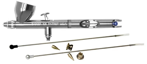 The Patriot, Model 105, is a comfortable, reliable, cost-effective, user-friendly gravity feed airbrush, designed for use by experienced, as well as novice airbrush enthusiasts. Its two angle needle tip precisely mates with the Patriot’s cone shaped nozzle, enabling a single needle/nozzle configuration to spray a variety of materials, while eliminating the need for multiple needle/nozzle variations. It has a 1/3 ounce permanently mounted color cup with a convenient spill-proof cap.