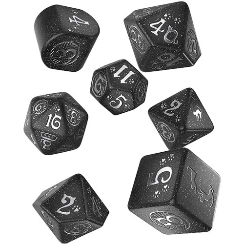 This dice set consists of 7 polyhedrons with digits kept in a feline font style, and you will find no less than 3 variations of their faces! Some show cat’s paws trails, others have a ball of yarn, and the highest ones depict cats in person, just doing their feline things!