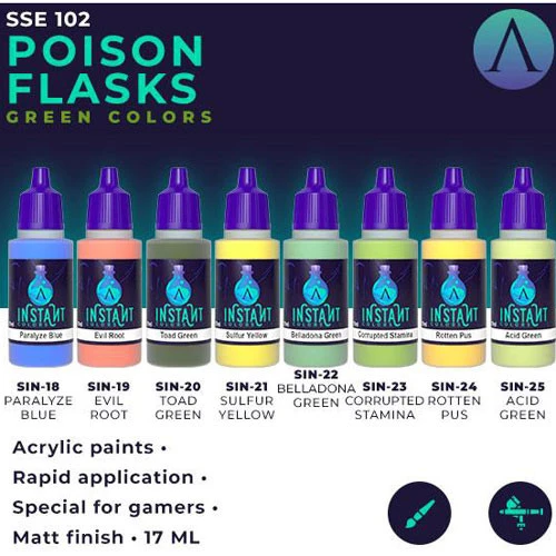 Use Poison Flasks to paint plants, orcs & goblins, dragons, forest creatures, green skin, green clothes, moisture, elementals, etc.