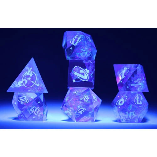 Give your players a new way to add excitement and intrigue to the table. Numbers appear in the blink of an eye under the black light. Each set comes with black light stylus. Stunning, sharp edge resin dice. Precision in every roll. Eye catching foils shine through in natural and black light. Roll the die for a suspenseful reveal! Did the BBEG fail the save or is the party in trouble? Blind challenges or gambles. No one will know who won until the light reveals the numbers!