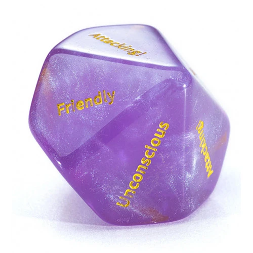 Random Encounter Dice (2) – A pair of purple dice, 1d10 and 1d12. This pair of dice not only instantly suggests the relative difficulty level of the encounter, from “Innocent” (ie: a squirrel) to “Deadly” (ie: an adult dragon), it also tells you the state you find it in. Yes, it may have found you first and is now attacking you, but perhaps it’s noticed you but is “Uninterested” or even sleeping! Guaranteed to increase the quality and variety of your random encounters!