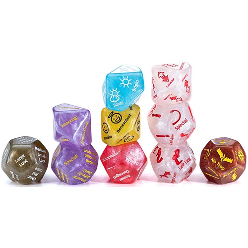 A specialty set of dice designed to assist noble Game Masters as they prepare on-the-fly adventures for their players.