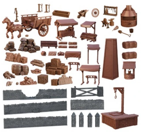 Everything you need to build a sprawling marketplace at the centre of a fantasy town, this set includes market stalls, piles of stock, rats, walls, a gallows, stocks, a blacksmith’s and so much more!