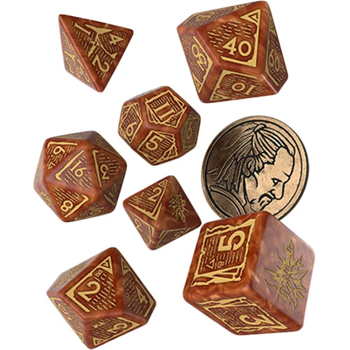 The set contains 7 polyhedral dice, and a metal coin featuring Vesemir’s depiction. Each die is painted caramel with golden engravings. The highest value faces, and the coin reverse, share imagery of a time-worn Wolf School symbol.